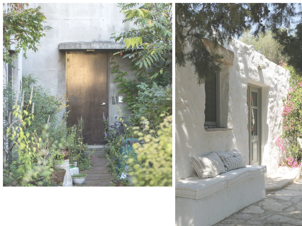 I love these next two images. (image 2) Mostly because of how a few textural details can dramatically change the vibe. Without which, you see them for what they are: large cement blocks with a door. Imagine these two homes without the layers of plants, vines, flowers, cyprus tree, bougainvillea, and bench of soft pillows on which to sit in the shade. Sad may be too strong of a word, but I’d find it uninviting, for sure.